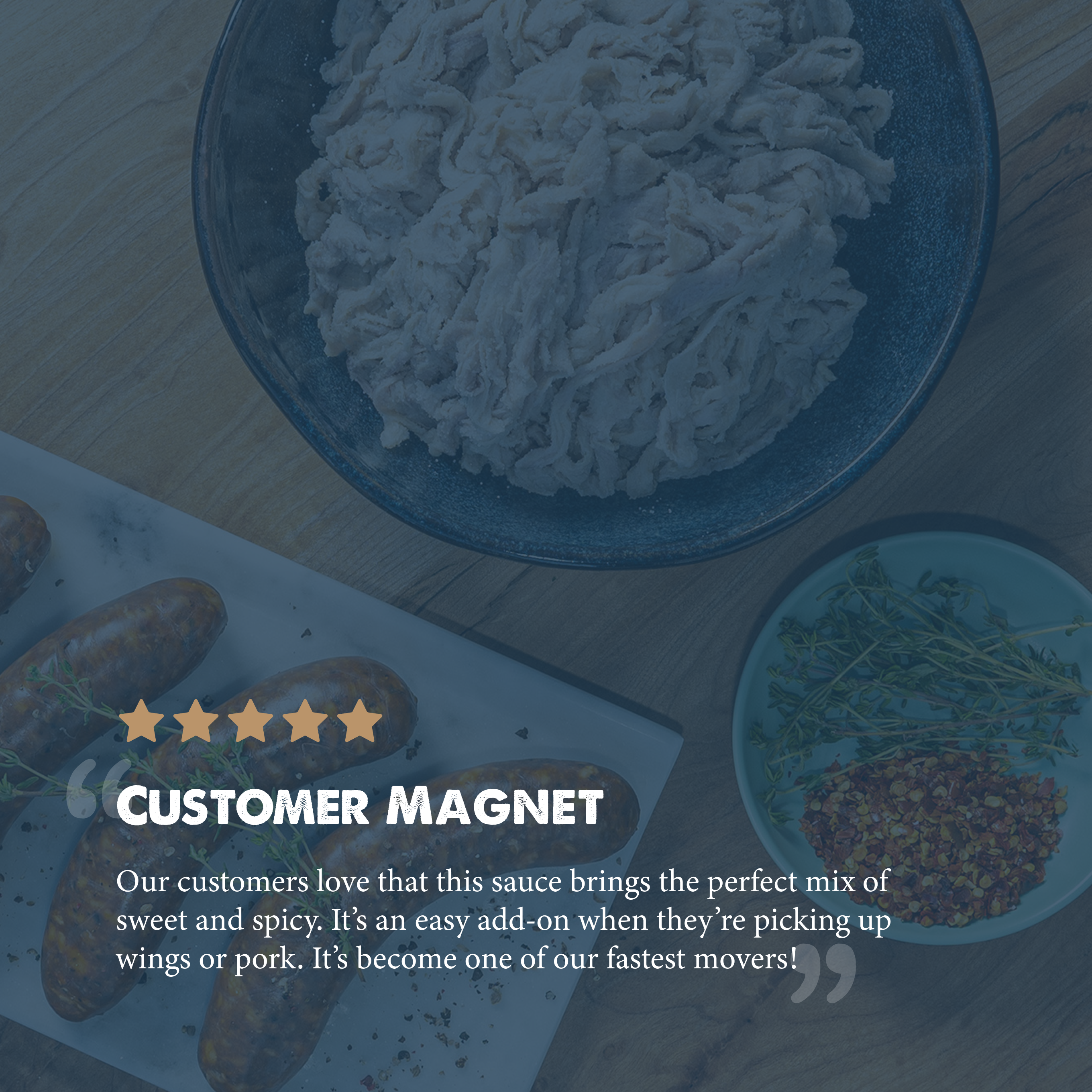 - Adds excitement to pork, wings, grilled sausages, and even veggie dishes. A favorite for customers looking to try something new and bold.